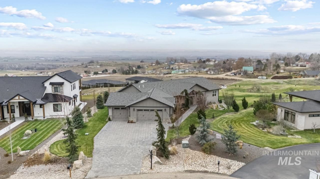 MOTIVATED SELLERS!! This home has a neighborhood community that makes you feel at peace. Whether you are enjoying a morning walk or a ride in a golf cart, you will enjoy the spectacular views this community has to offer. This Custom home features 3315 sq feet of living space offering 4 beds, 3.5 baths, and sits on 3.83 acres with panoramic views of the Owyhee Mountains and the Snake River. This home offers two on suites, an ensuite for two additional bedrooms, two large living rooms with a beautiful double fireplace, and the kitchen is a chefs dream with a large bar counter top. The custom paver drive and walkway lead to a water feature by the front entry and a 3-car garage. Beautifully landscaped with plenty of grass to enjoy outdoor activities. The property has 2 tee boxes for the golf enthusiast and the change in elevation presents a unique challenge. Back covered patio has an inviting outdoor living room with TV wall mount, hookup for a propane fire pit, built-in BBQ and cooking area. Enjoy an evening in the stars with the open area where you can sit in the hot tub, and enjoy the breath-taking views of the Owyhee Mountains. Property has additional access off Charleston Rd- the perfect place to put a shop!