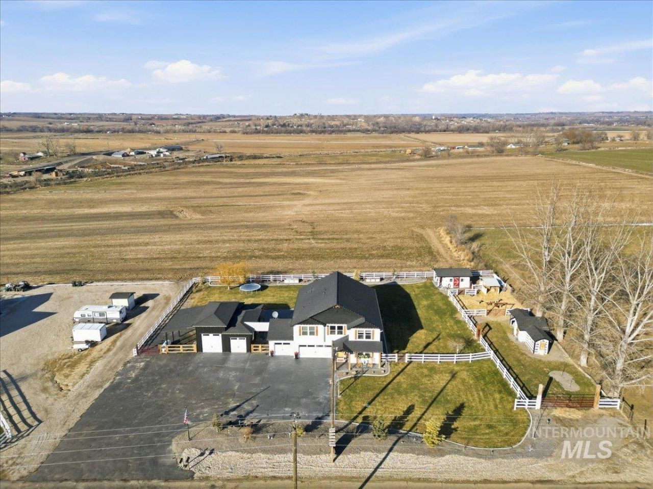 Welcome to this stunning two-story modern farmhouse, set on a full acre in peaceful Homedale. Better than new, this home features a 3-car garage, a 25 x 27 heated shop for boat, side-by-side, or woodworking, plus covered RV parking with hookups. Inside, an open floor plan showcases a kitchen with a large island?perfect for family meals or game night. With 4 bedrooms plus an office/flex with closet, theres room for everyone. Relax under the full-length covered patio and take in majestic Owyhee Mountain views. The expansive lot is fully equipped for your country lifestyle, featuring a chicken coop, small pasture, and hay cover and tack shed with power?ideal for hobby farming or keeping animals. Theres also plenty of room for pets, gardens, or additional projects. Country living meets comfort and convenience in this exceptional property.