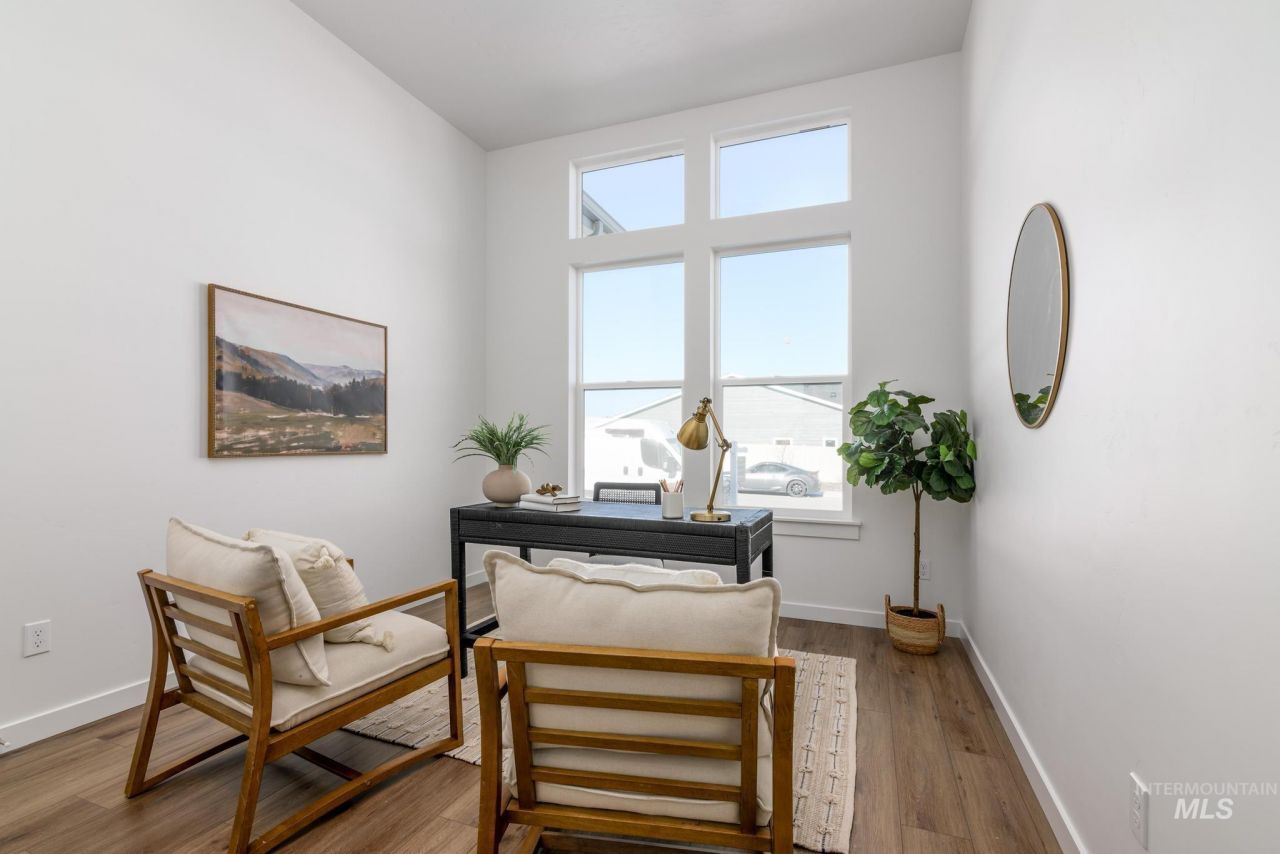 The Bannock exudes contemporary comfort and functionality, exemplified by its thoughtfully crafted single-story layout. A long foyer sets the stage, leading to a spacious great room seamlessly connected to the kitchen, casual dining area, and covered patio?an ideal setting for gatherings and relaxation. The kitchen is centered around a striking large center island and enhanced by its expansive walk-in pantry. The primary bedroom suite, nestled in the rear of the home, features a serene sanctuary complete with a luxurious walk-in closet and a primary bath with separate vanities, and a luxe shower. Off the foyer, two secondary bedrooms share a hall bathroom offering privacy and comfort while a private office sits adjacent to a convenient powder bath. 3 car garage. Front and rear landscape included. Home is under construction and photos are similar. BTVAI
