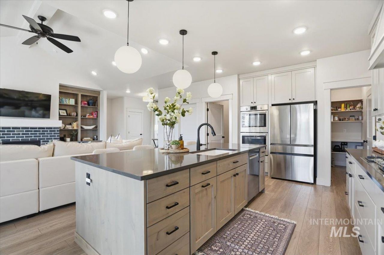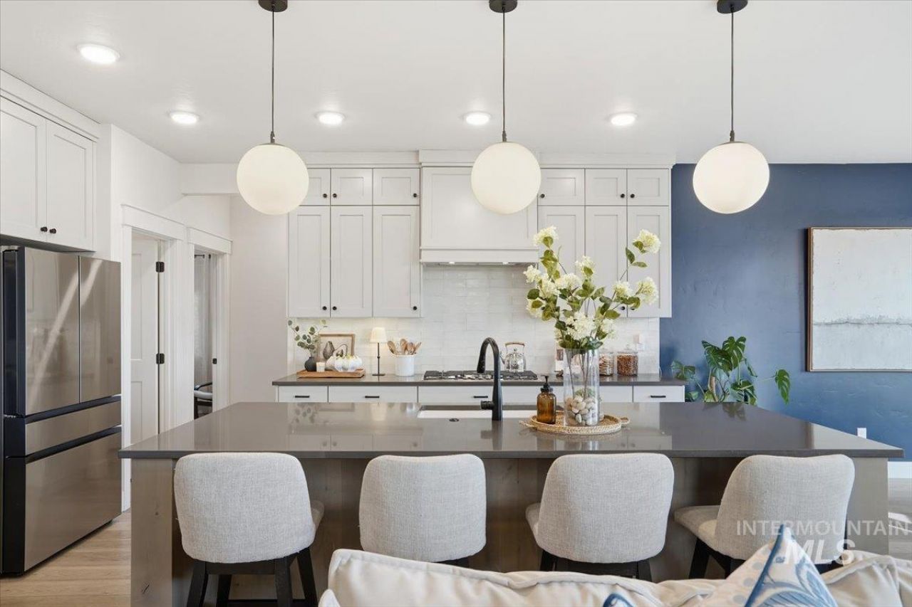 Welcome to Riverstone - a gated, resort-style community offering modern elegance and effortless living. This light-filled home features sweeping Bogus Basin views with no back neighbors, a split floor plan, vaulted ceilings, and refined designer finishes. The gourmet kitchen shines with quartz countertops, a large island, double ovens, and stainless steel appliances. The great room offers a cozy gas fireplace with custom built-ins, and a nearby private office/tech center for convenience and flexibility. The primary suite is a true retreat with patio access, a spa-inspired bath, and an expansive walk-in closet. The zero-maintenance backyard with a covered patio includes turf, garden beds, fruit trees, berry bushes, and is fully prepped for a hot tub. Additional upgrades include an enhanced HVAC system, whole-house humidifier, and an oversized two-car garage with extra storage and a Level 2 EV charger. Enjoy unmatched community amenities: a beachfront park, stocked ponds, Beach Club access, resort-style pool, fitness center, clubhouse, miles of pathways, and private Boise River access for paddle boarding and kayaking. Perfect for those seeking privacy, connection, and a true lock-and-leave lifestyle.