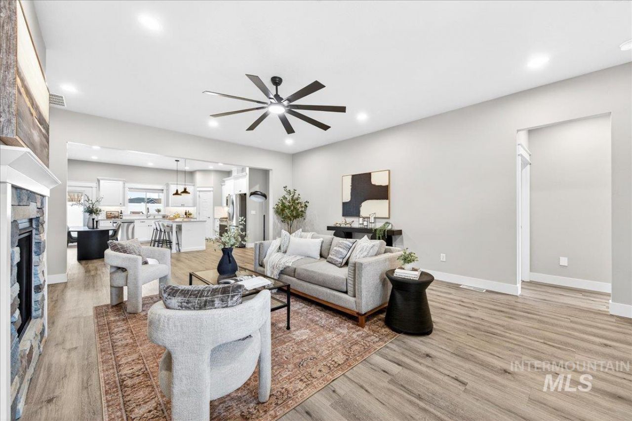 Discover modern, custom design, single-level living in Nampas Pheasant Meadows at this upgraded 2022-built gem backing to open common space with no rear neighbors. Relax on the front porch with room for rocking chairs ? the perfect spot to unwind and enjoy peaceful Idaho evenings. The open kitchen shines with quartz counters, a large island, a gas range, full tile backsplash, custom soft-close cabinetry, pull-out shelving, and under-cab lighting. The great room features a stone gas fireplace & built-in shelves. The primary suite offers quartz vanities, a freestanding tub, tiled walk-in shower, dual sinks, a makeup vanity, an oversized closet, and direct laundry/mudroom access with cabinetry. Split bedroom floorplan for privacy. Enjoy a 30ft deep garage, large back covered patio, full landscaping with auto-sprinklers, & 6-ft white vinyl fencing. Easy I-84 access, near parks, schools, and shopping.